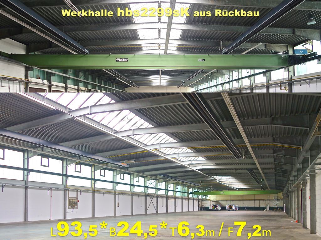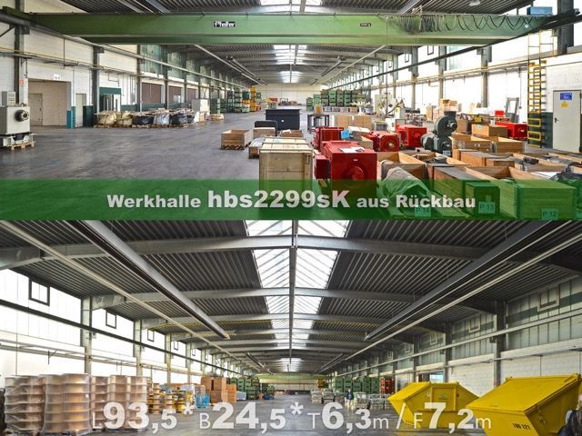Demontierbare Stahlbauhalle, Bj. 99, mit einer Grundfläche von ca. 1683 m², die demnächst abgebaut werden kann. Es handelt sich um eine wärmegedämmte Stahlhalle, deren Tragkonstruktion, wärmegedämmte Gebäudehülle und Ausstattung wiederverwendet werden können.